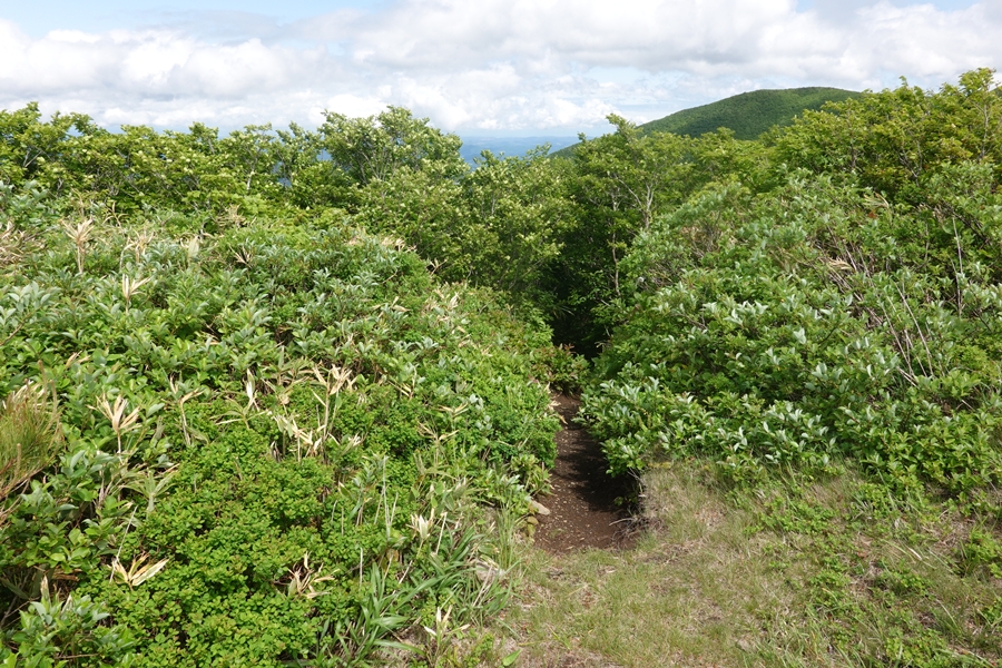 下山はこちらから・・しばらく背が低い話の中を歩くので中腰気味でした。 |