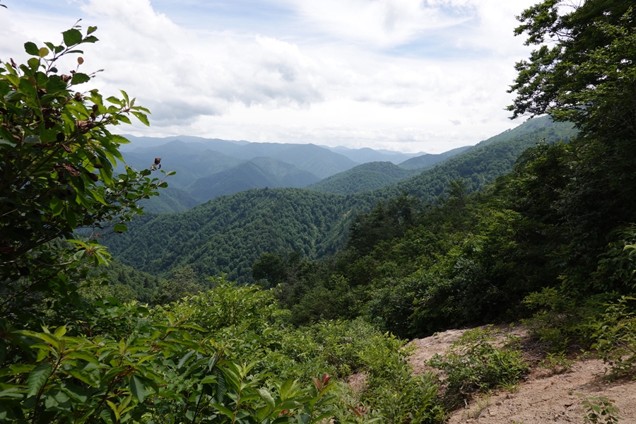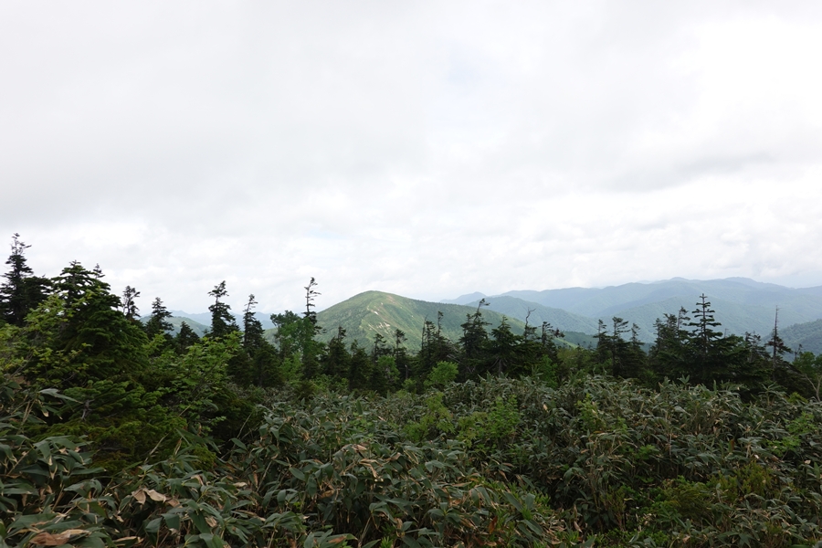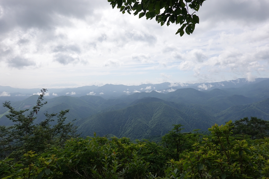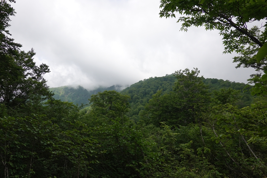 会津駒ケ岳につながる山並み。 雲がかかったまま。 |