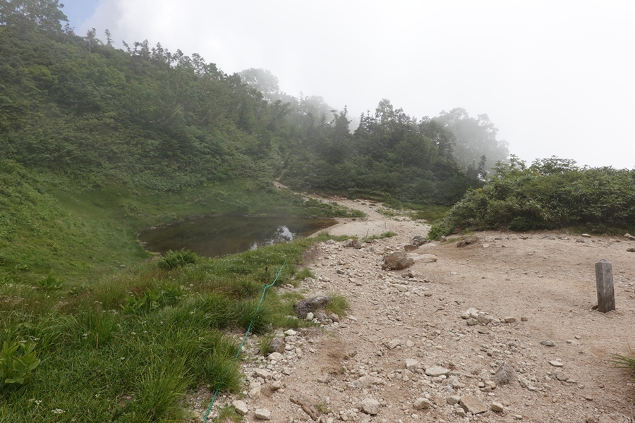 西遠見池までくると、後はなだらかな道を歩くだけ。 雲の中に入り、少し暑さがマシになりました。 |
