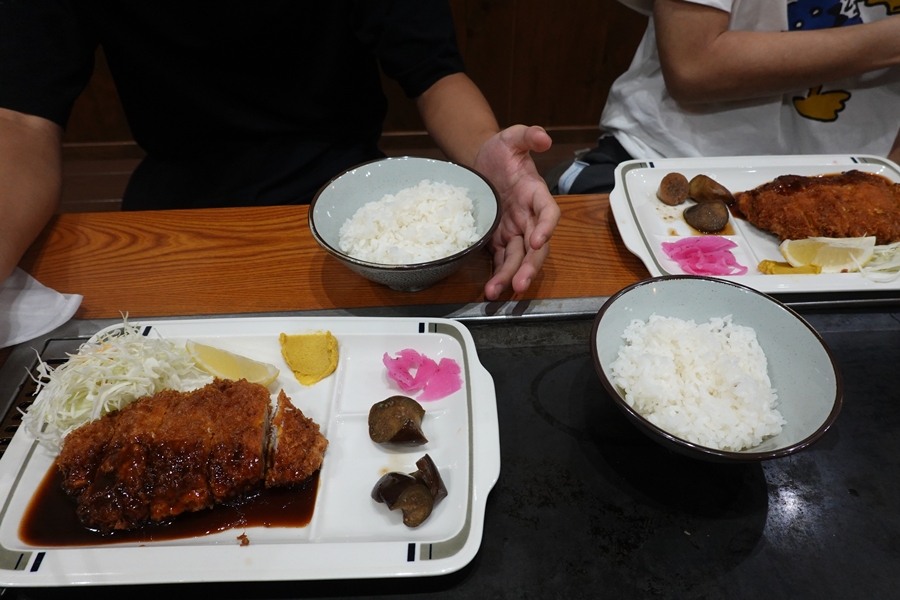 3人ともとんかつ定食。ミニラーメンもついてました。 |