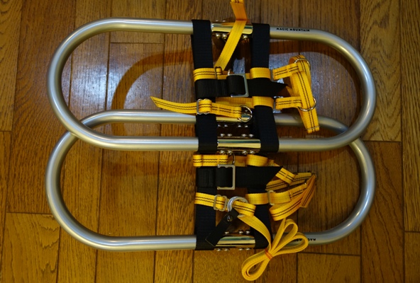 子供用のスノーシュー。子供には軽くていいのかな。クランポンのところについた雪が固まって