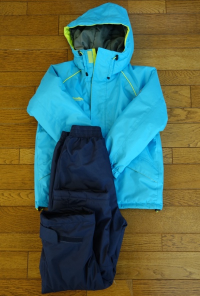 子供のスキー&雪山歩き用ウェア。上下で7000円程度と作りも防寒性もコストパフォーマンス良い感じ。