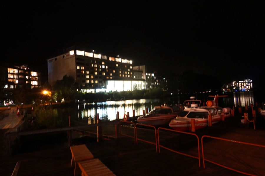 夕食後、雨がぱらつく中、ホテルの外へ。湖畔にホテルが立ち並んでます。 |