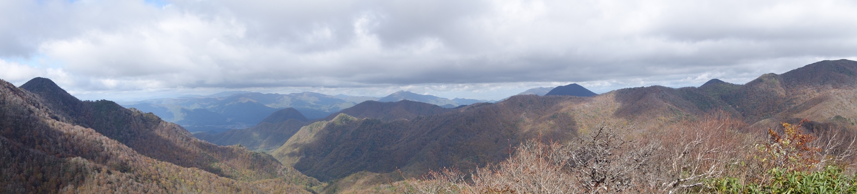 那須連峰側。 旭岳〜三本槍岳あたりは雪化粧。 8月に歩いた赤面山も見えています。 |