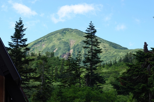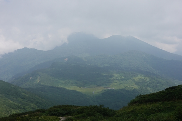 向かいの妙高山も見えてきました。 高谷池ヒュッテも小さく見えてる。 |