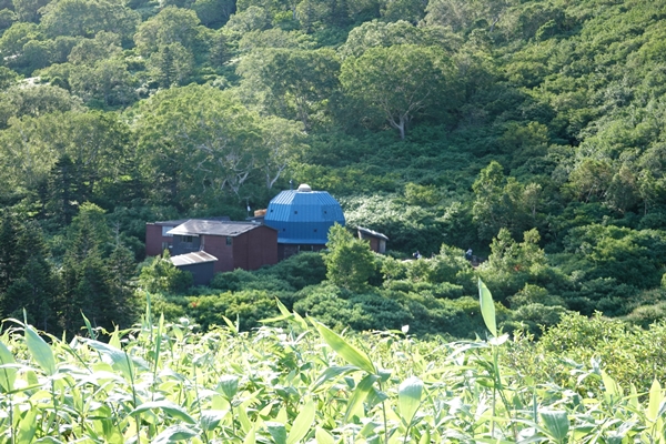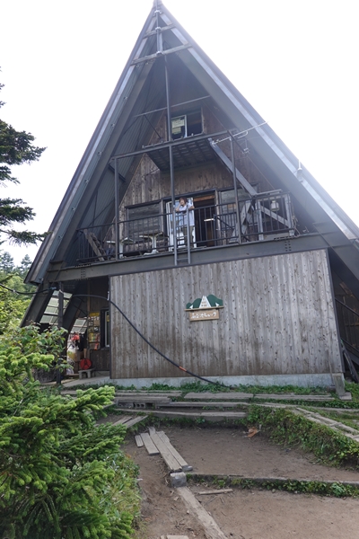 高谷池ヒュッテが見えました。 火打山は雲の中。 |