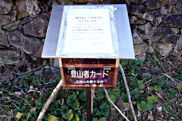 椚平登山口にある登山ポスト。 新年のあいさつ分がすでに貼ってありました。 |