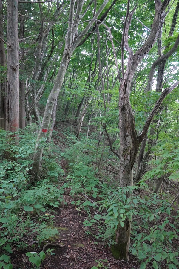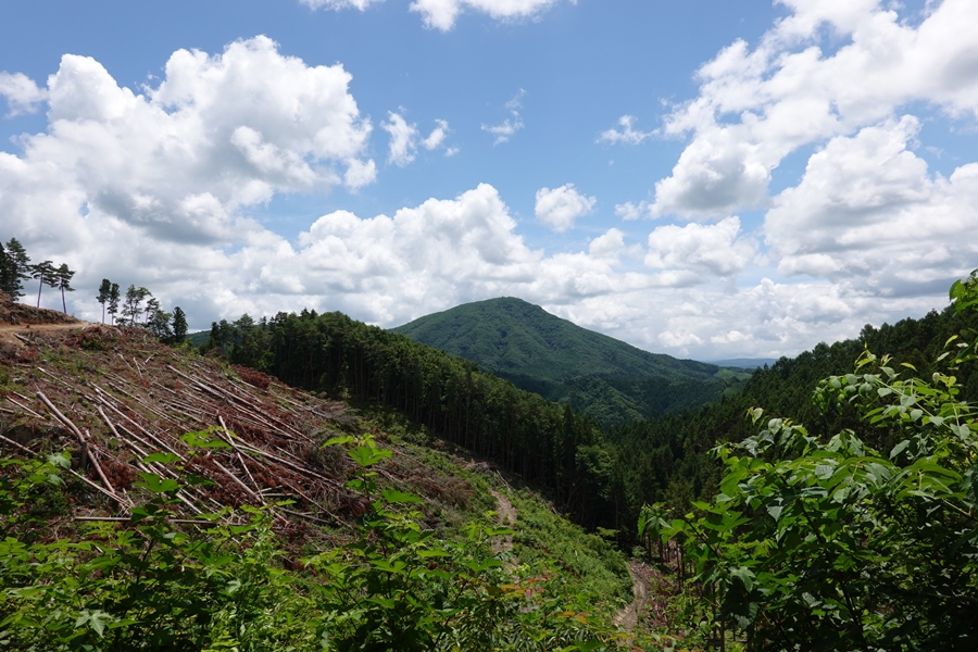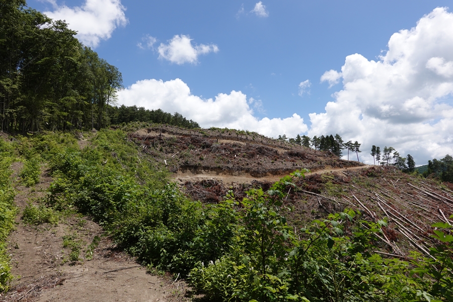 今度は伐採地が出てきました。 木を運び出すためと思われる道がいくつか走ってるので登山道がどこか分かりにくいところも。 |