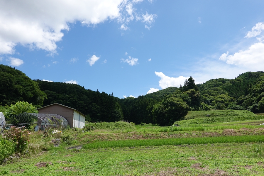 ここが登山口です。 右側の畑の土手を歩いていきます。 |
