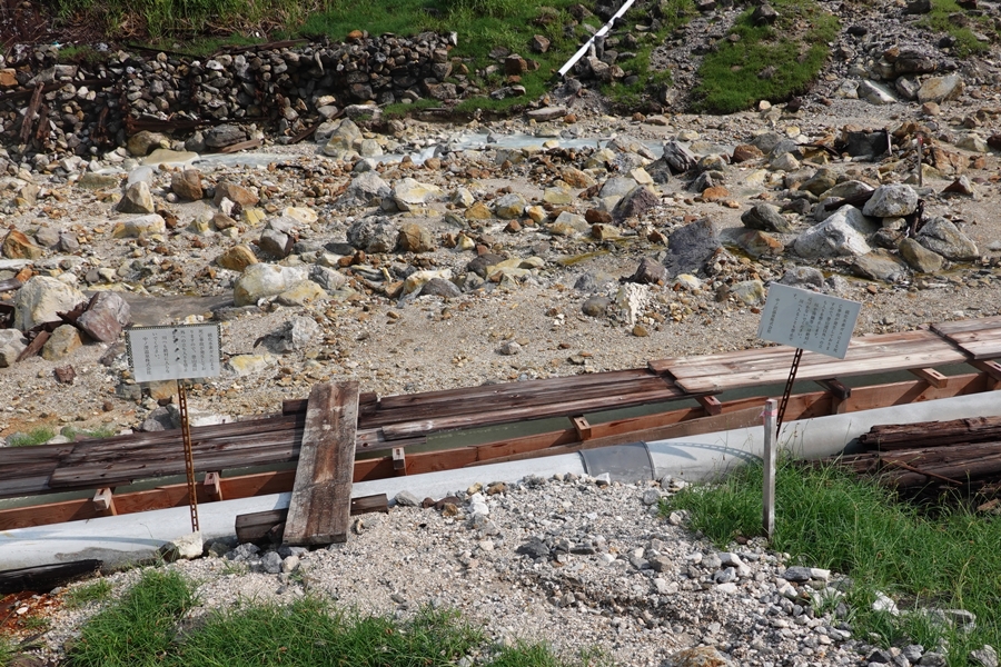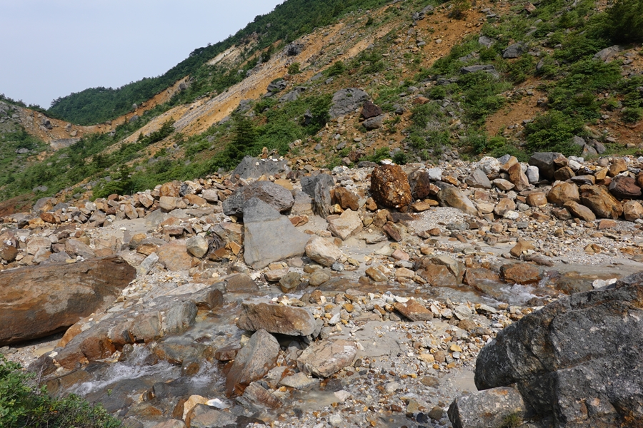 川も温泉色・・硫黄川ですもんね。 ぬるい温度で臭いも漂ってます。 |
