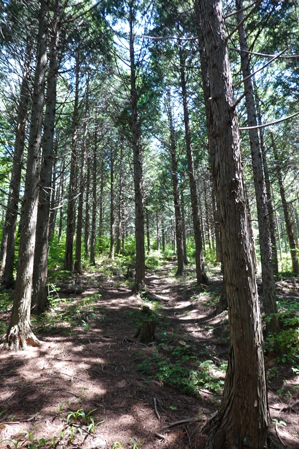 杉林の中を歩きます。 虫が耳元でうるさいですが、歩きやすい道。 |