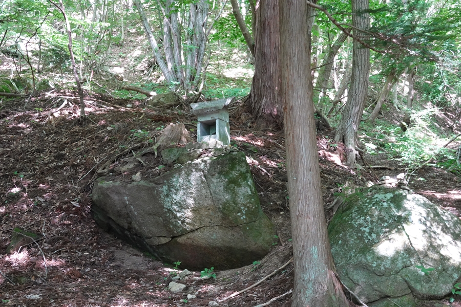 大きな岩の前に祠。 左右どちらにも踏み跡があり、左回りで山頂へ・・岩の上に積もった葉っぱを道と勘違いしてヒヤッとしました。。 |