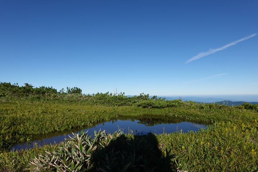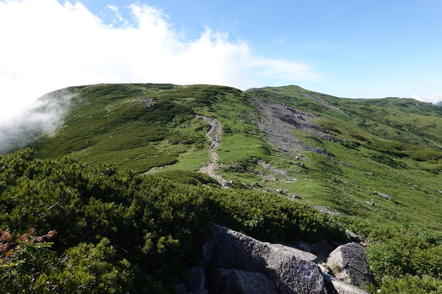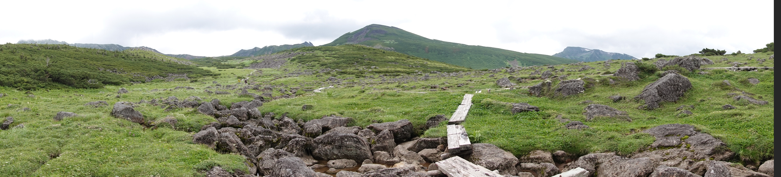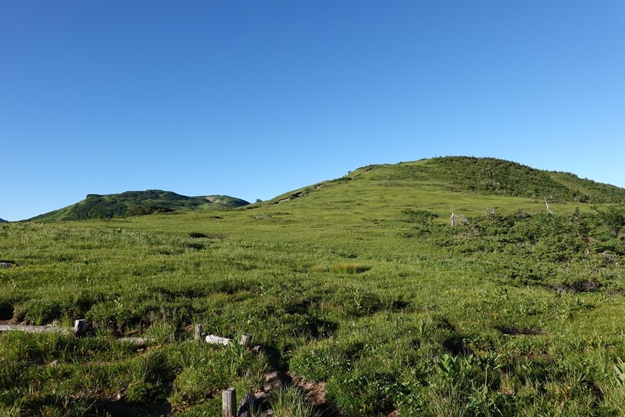 なかなかない風景の中を歩く妻。 尾瀬のような湿原でも、美ケ原のような人の手が入った草原でもない、山の上の草原。 |