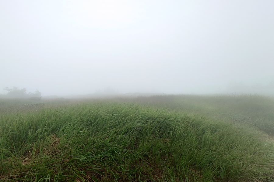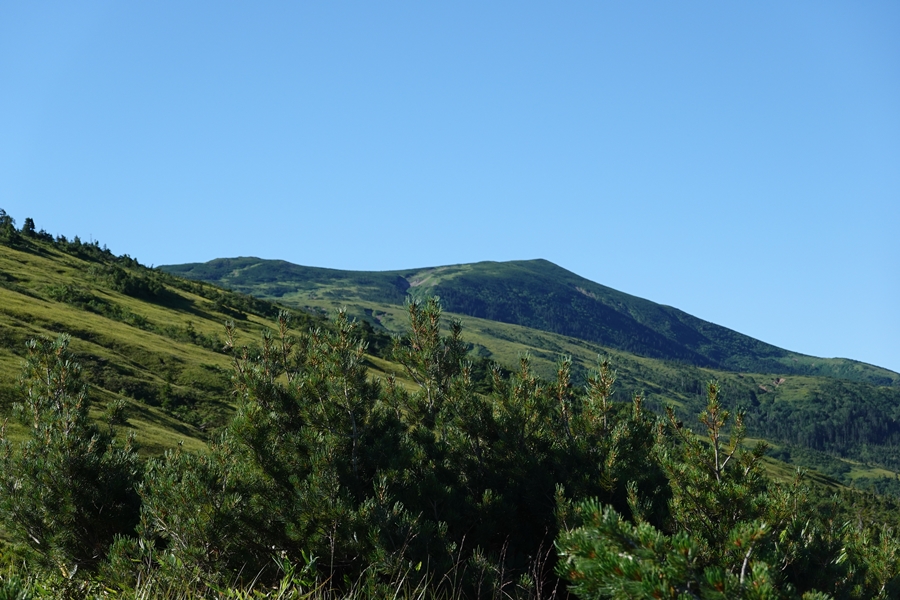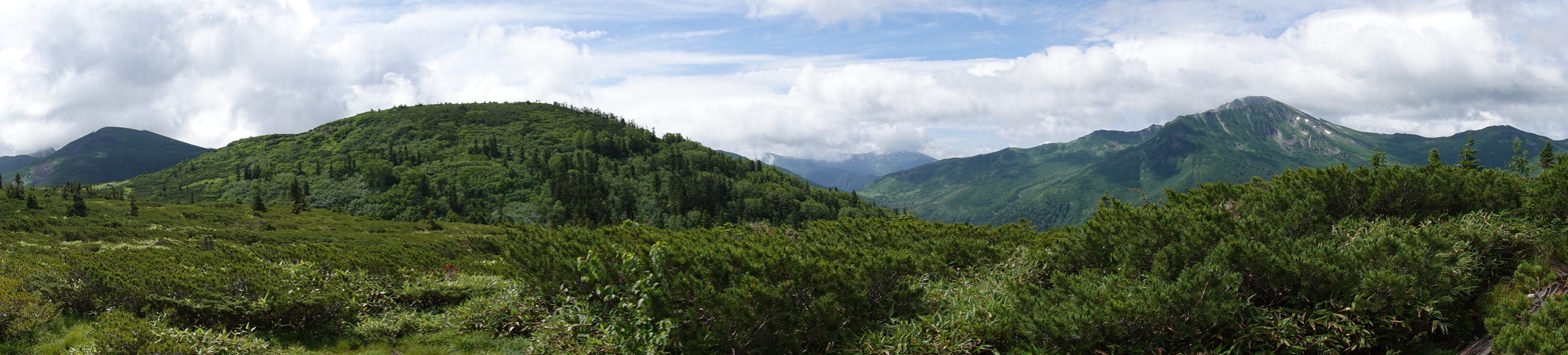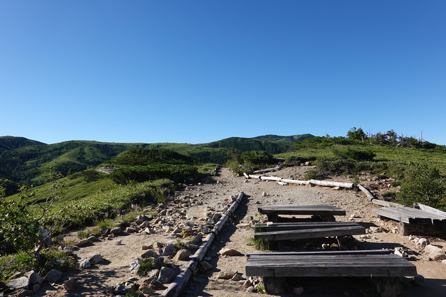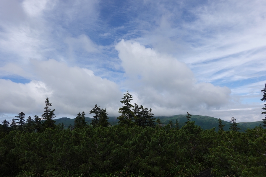 なかなかない風景の中を歩く妻。 尾瀬のような湿原でも、美ケ原のような人の手が入った草原でもない、山の上の草原。 |