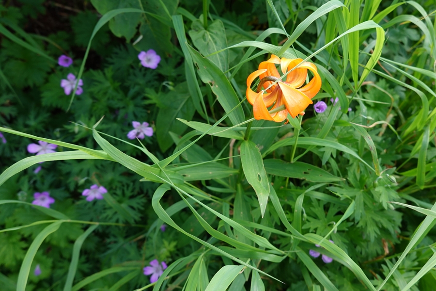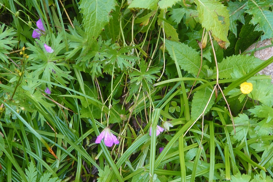 雨の中咲く花たち。 青いのはハクサンフウロ? |