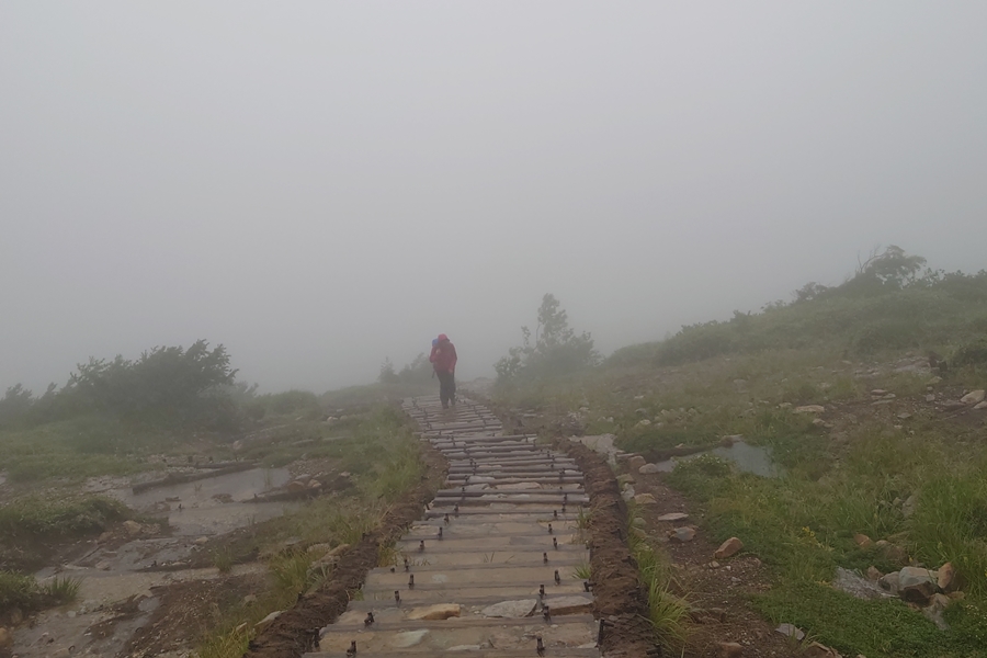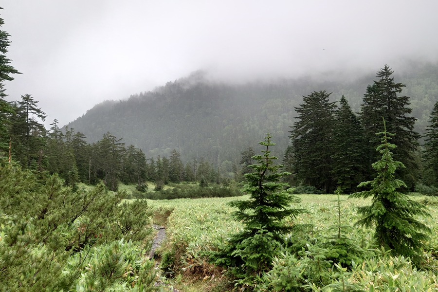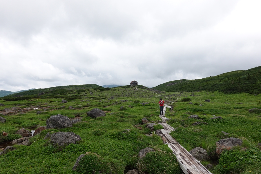 カベッケが原・・小屋までもう少し。 靴の中はビショビショ・・トレッキングシューズの防水、太郎平までももたずでしたが、足先が冷たくなかったのが幸い。 限界があることを体感しましたが、防水スプレー等するともっと耐えるのでしょうか? |