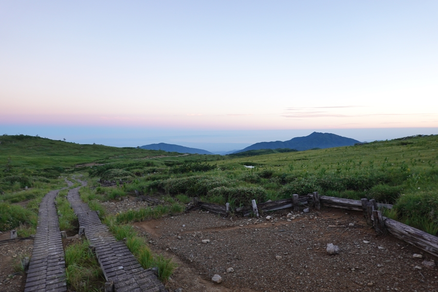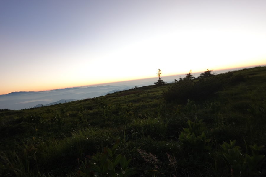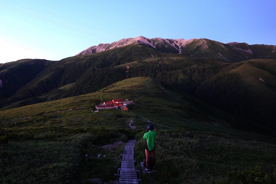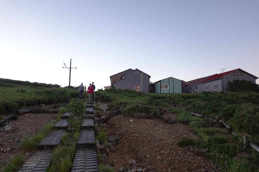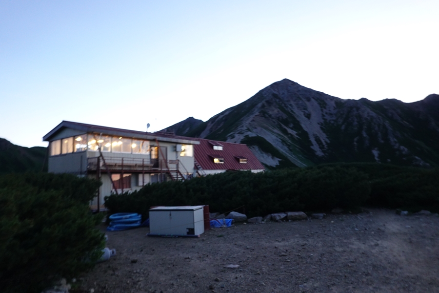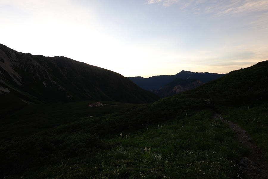 太郎山の端から太郎平小屋が見えた時はほっとしました。 実際はもっと暗かったですが、おひとりほぼ同時に下山した方(お元気)がいらっしゃいました。 |