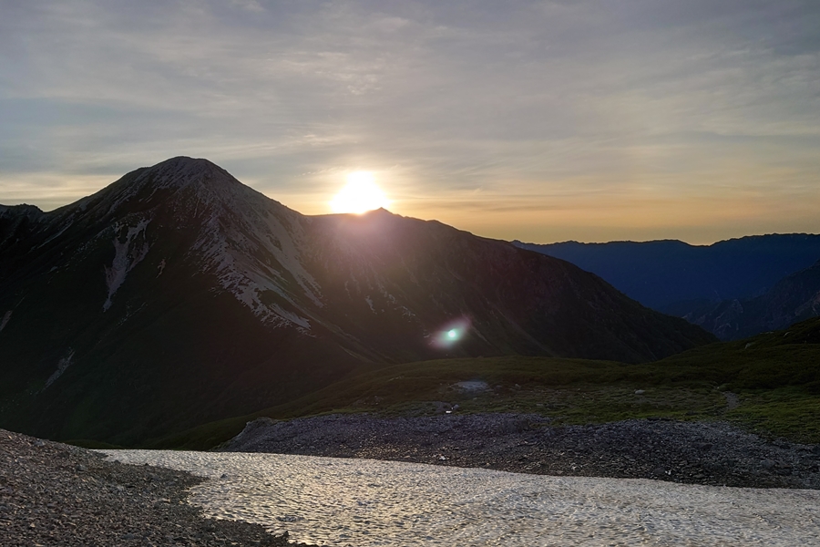 薬師岳のあたりから日の出らしいですが、小屋の黒板をよく見ると1時間後でした。 日が高くならないと山を越えないようです。 |