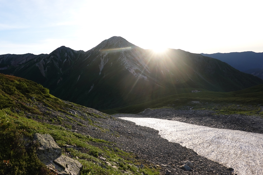 雪渓を超えたところで鷲羽の肩に朝日。 |
