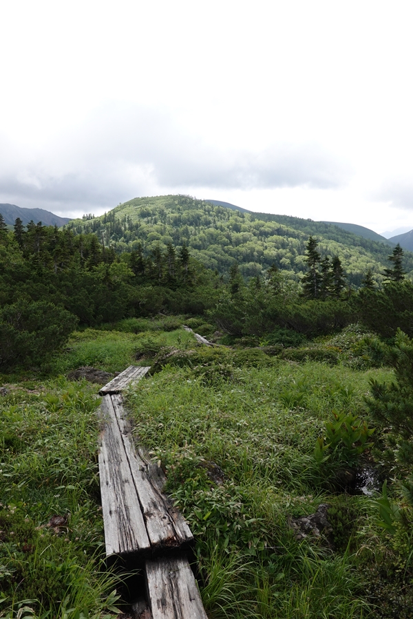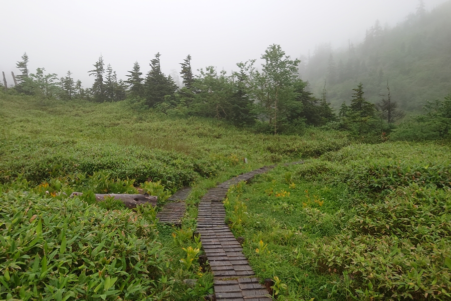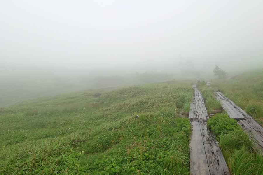 すれ違った方に、木道がシーソー状態になっているところで奥様がこけて顔を怪我したと情報をもらい、木道もいつもより慎重に歩きました。おかげさまで無事。 |