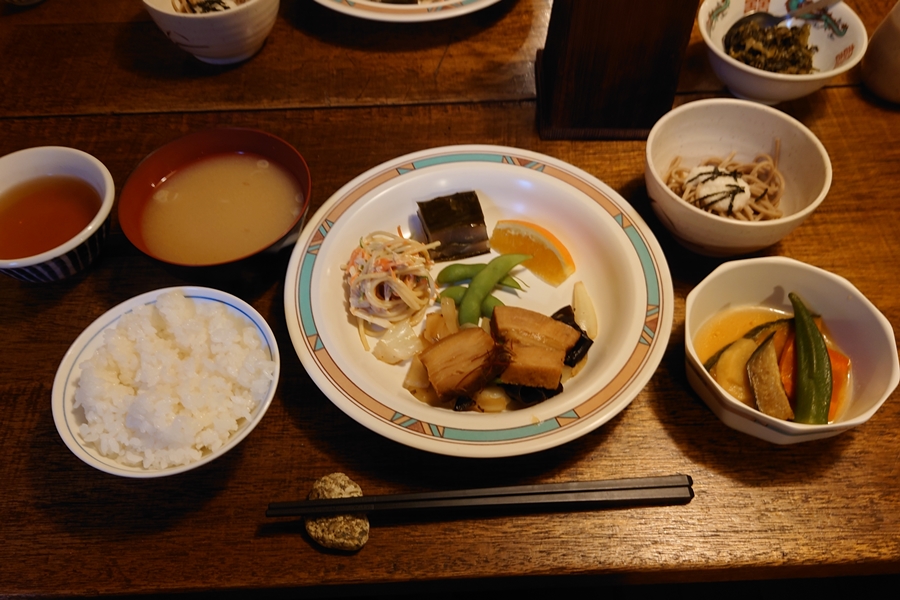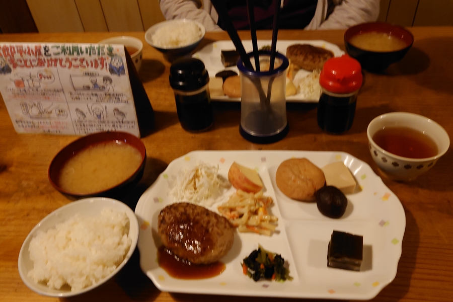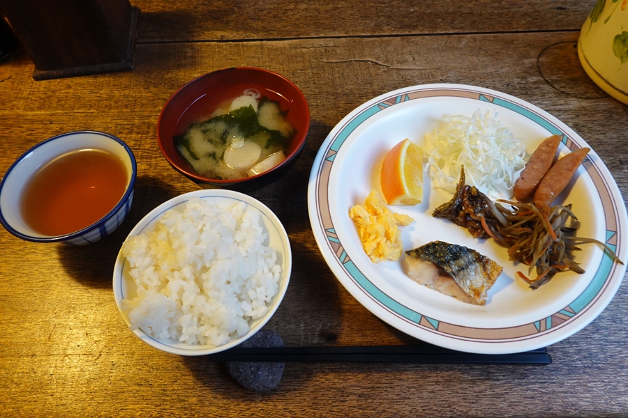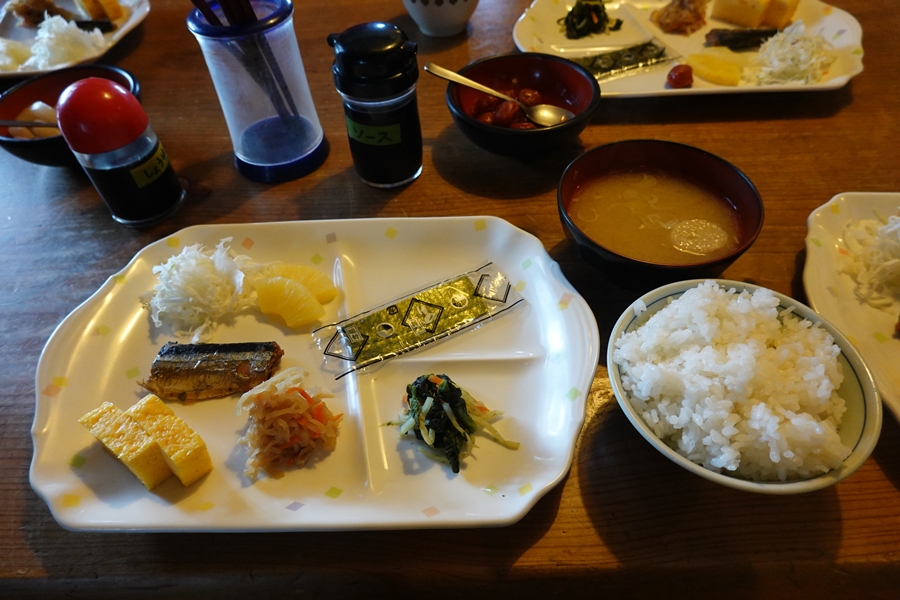 朝食。 隣の方、80才で前日スゴ乗越から歩いてきたとか・・すごい。 |