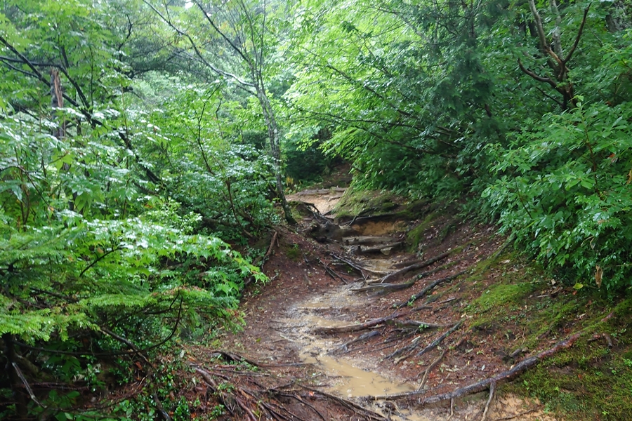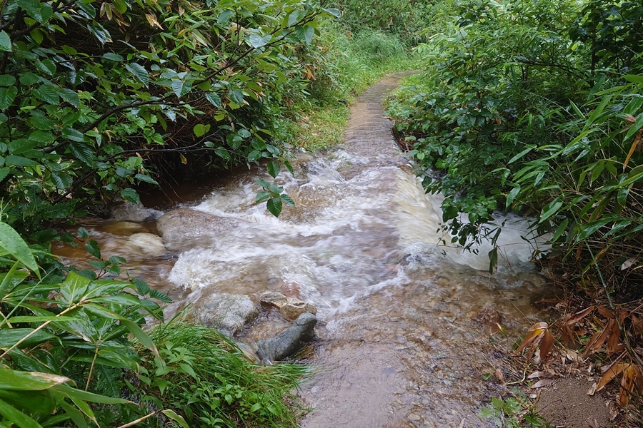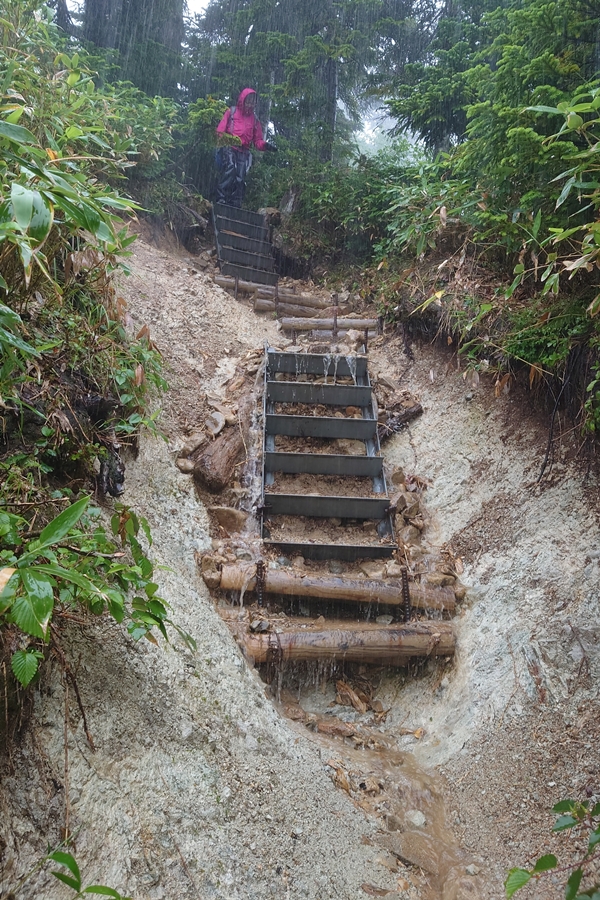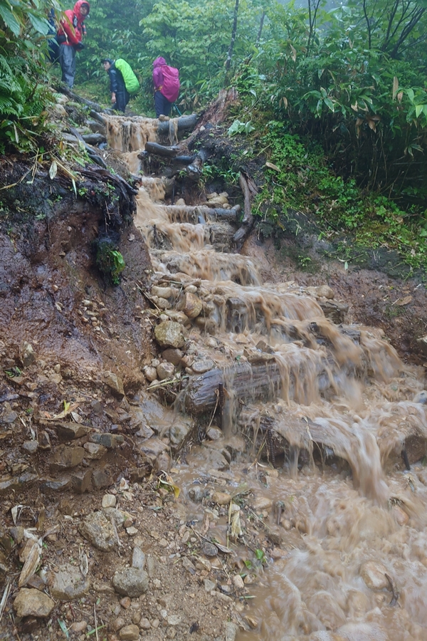 階段を滝のように水が流れています。 ここだけではなく薬師沢小屋までずっとでした。 |