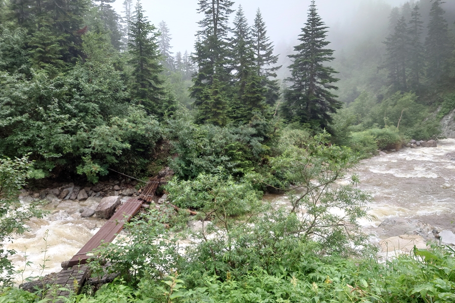 増水して川の水が橋の上。 数センチでも足が持っていかれそうになるので、妻と慎重に歩きました。 |