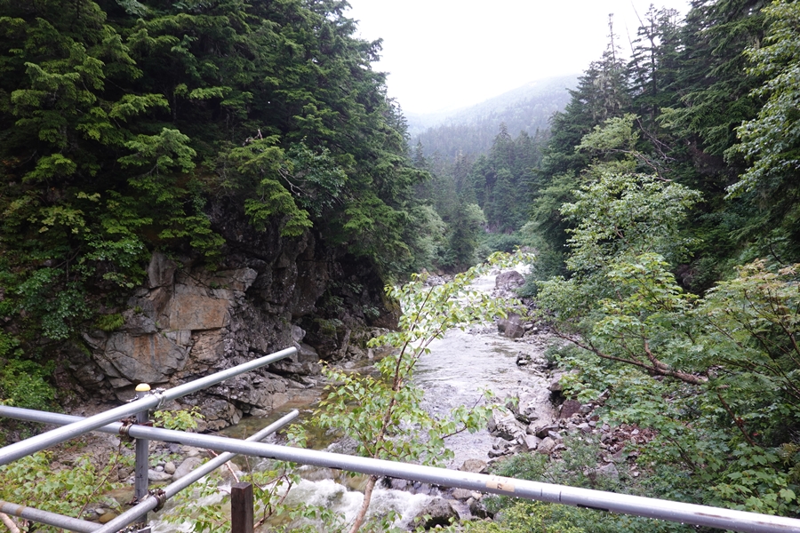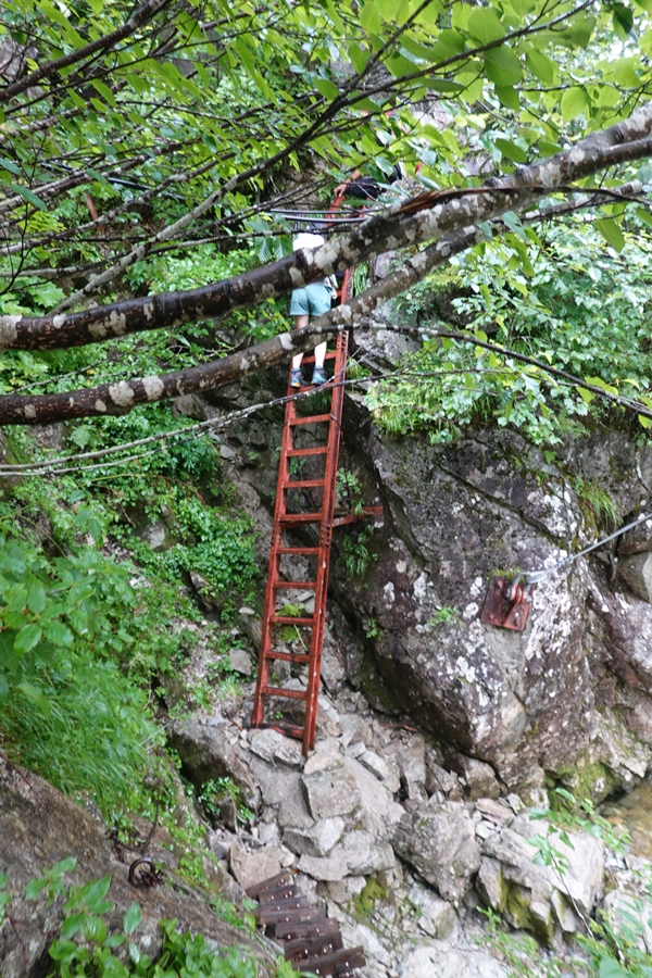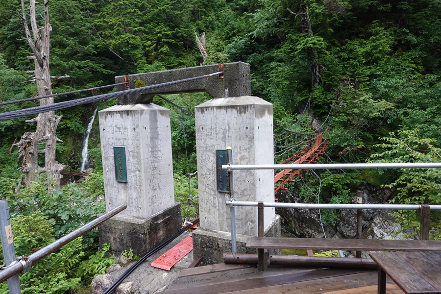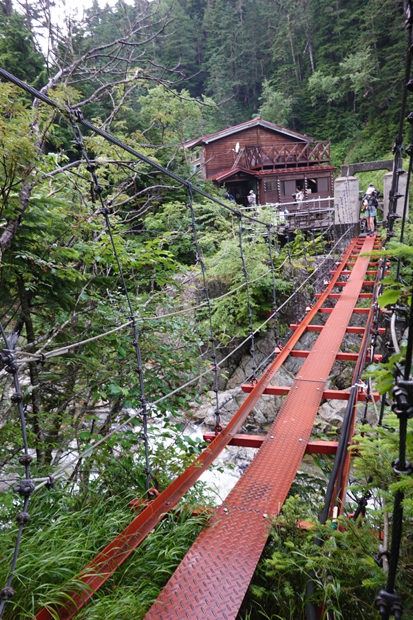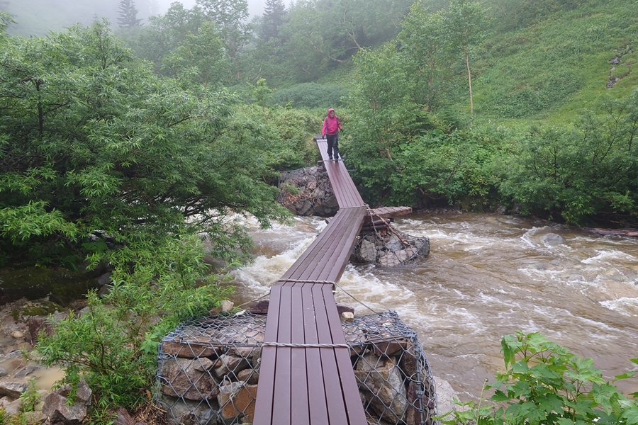 薬師沢小屋名物?の吊橋を渡って2日目スタート。 どうしても下を見ながら歩くし、怖いですね。 |