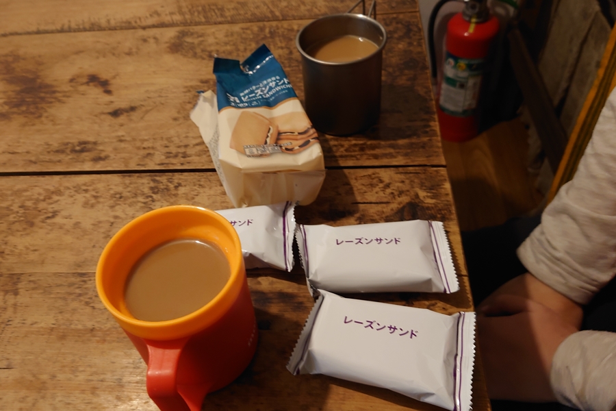 小屋で一息ついた後、ティータイム。 あったかいのが美味しい。 |