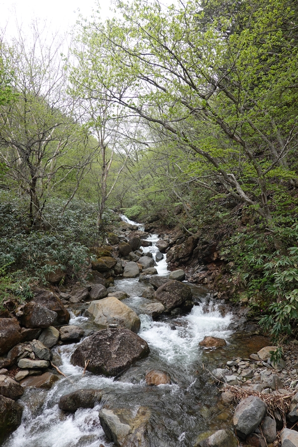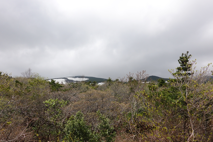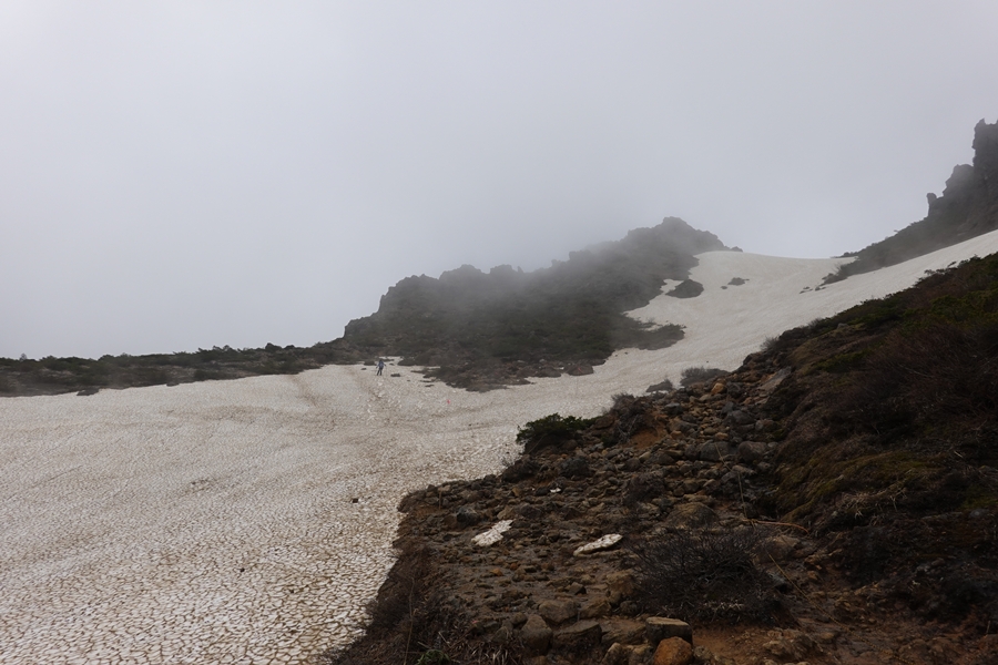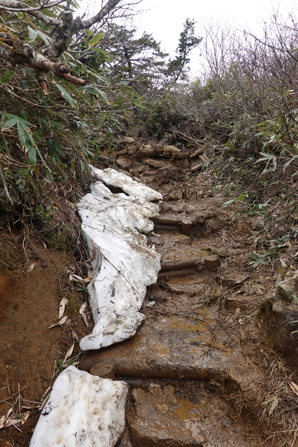 腹ごしらえして山頂を目指して歩いていきます。 だいぶ雪も消えて水が流れている感じはなかったですが、残雪が少し。 |
