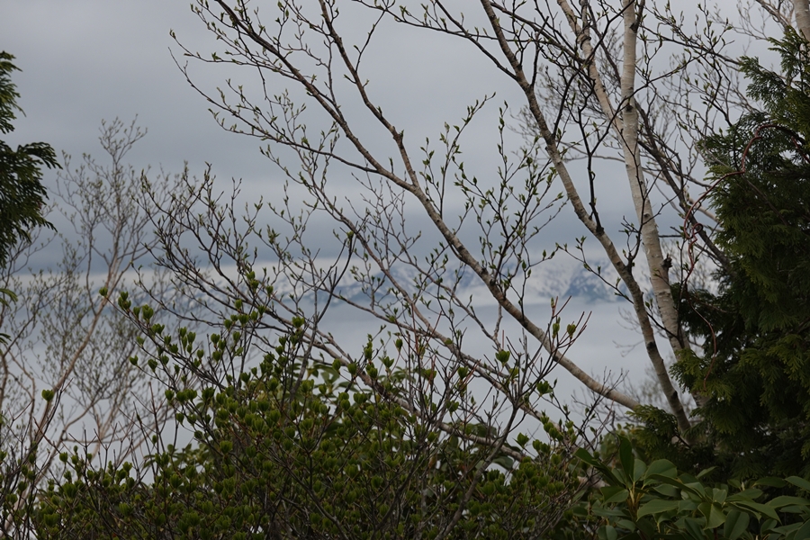 木の奥にある白い山が会津駒ケ岳みたい。 |