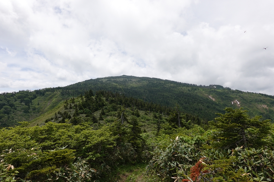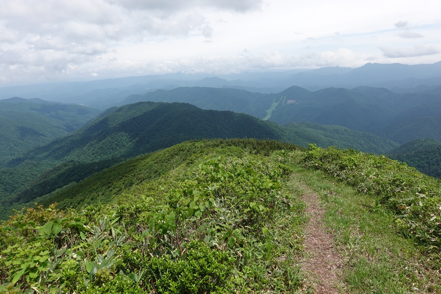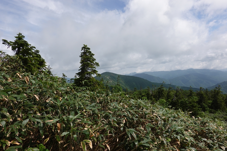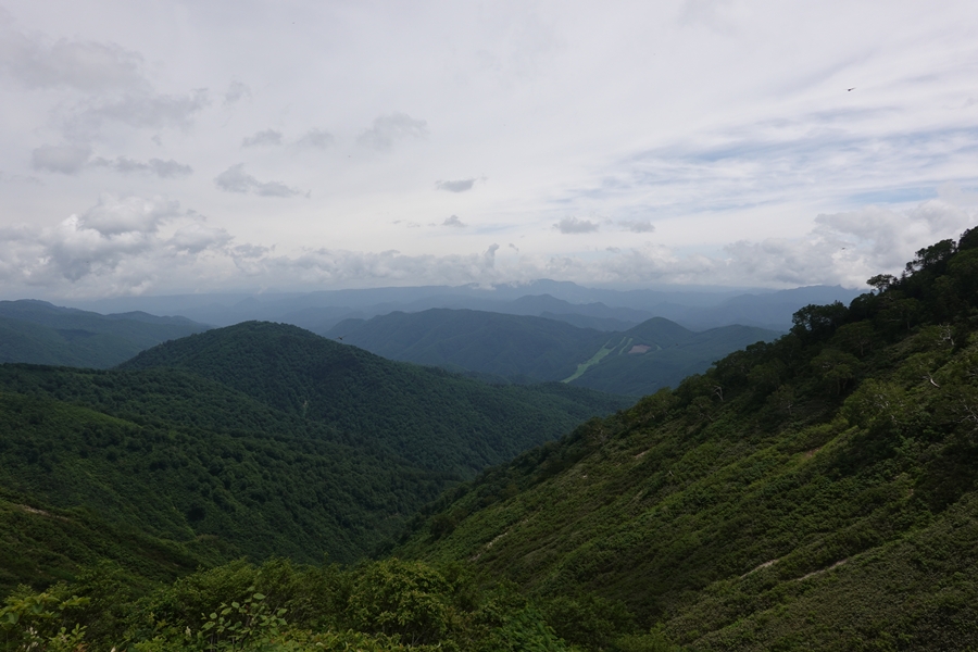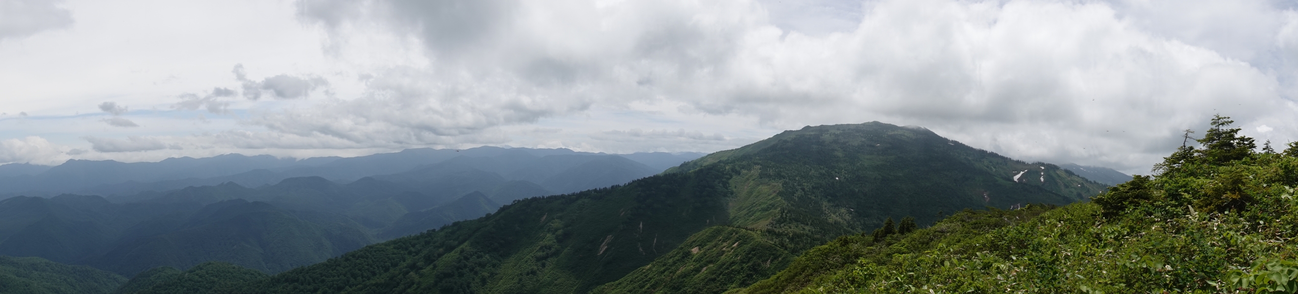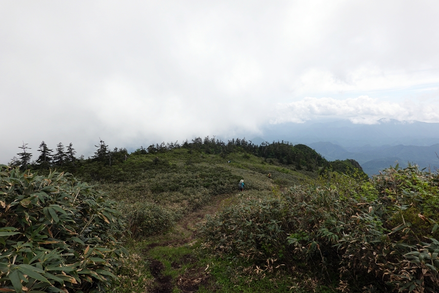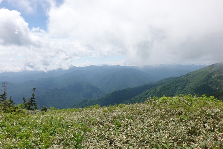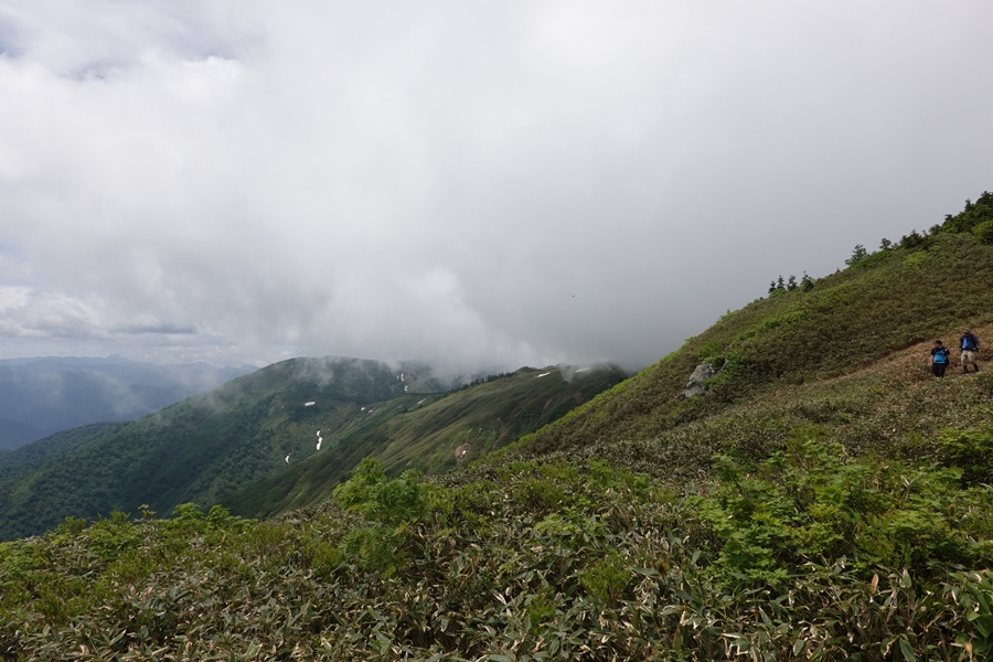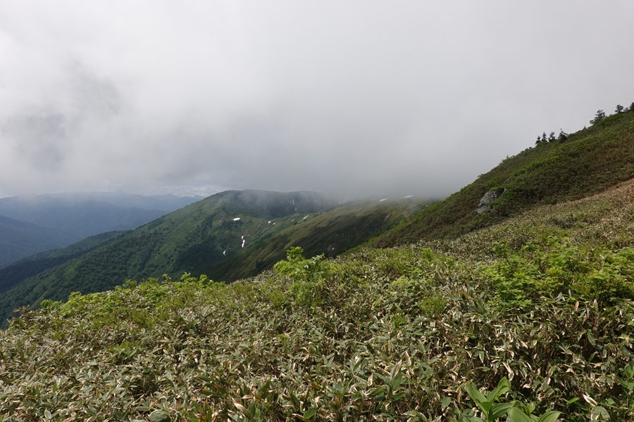 会津駒ケ岳につながる山並み。 雲がかかったまま。 |