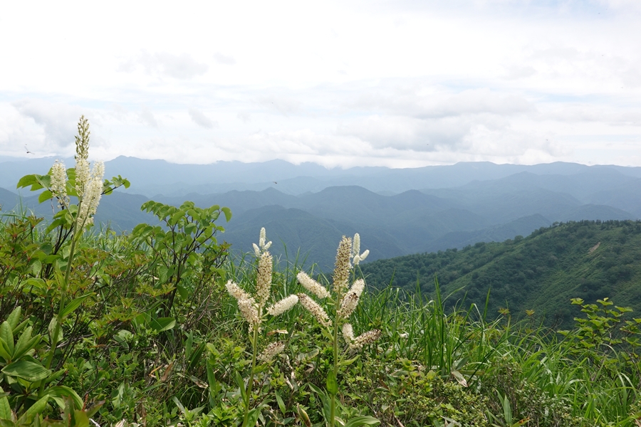 コバイケイソウとともに山並みを眺める |