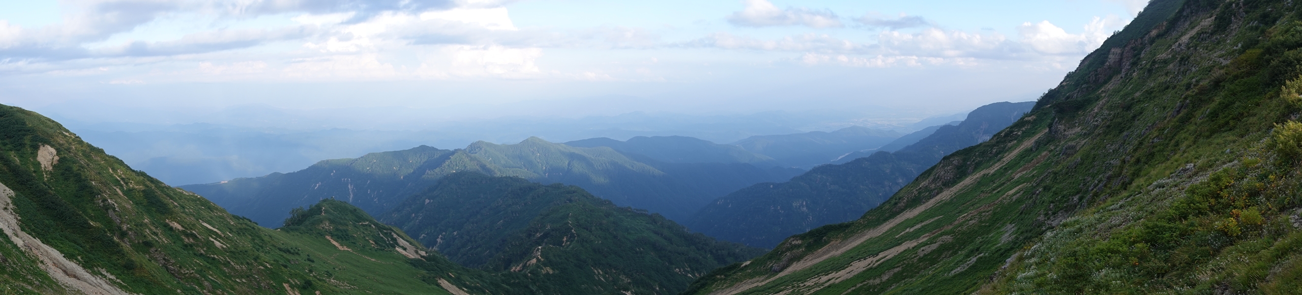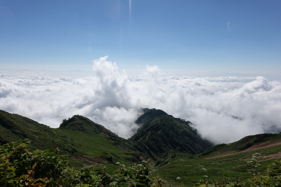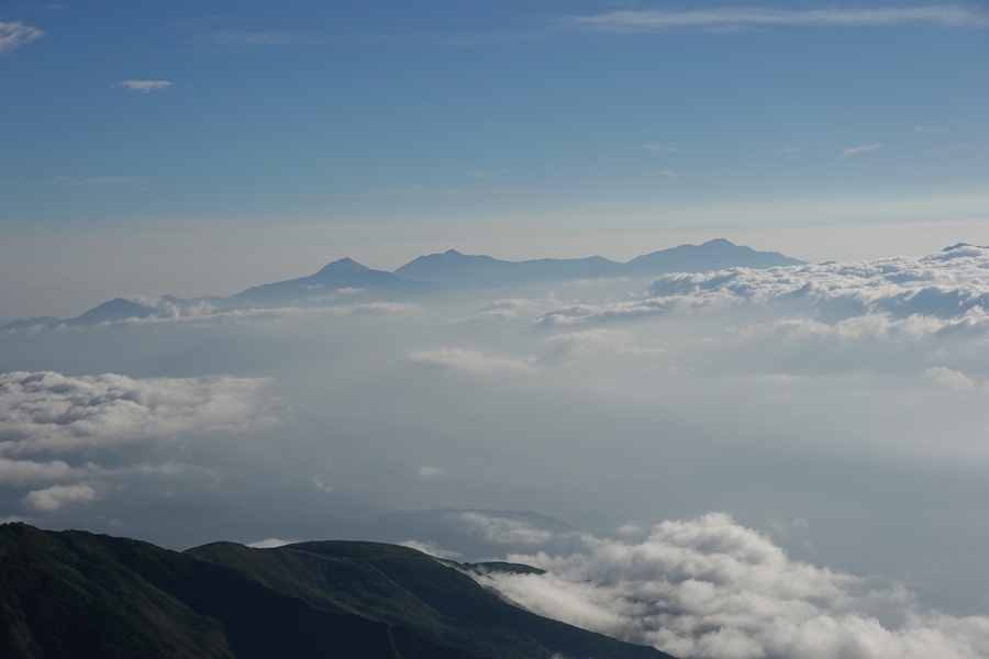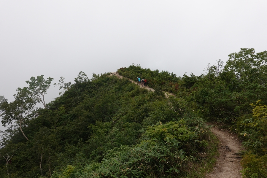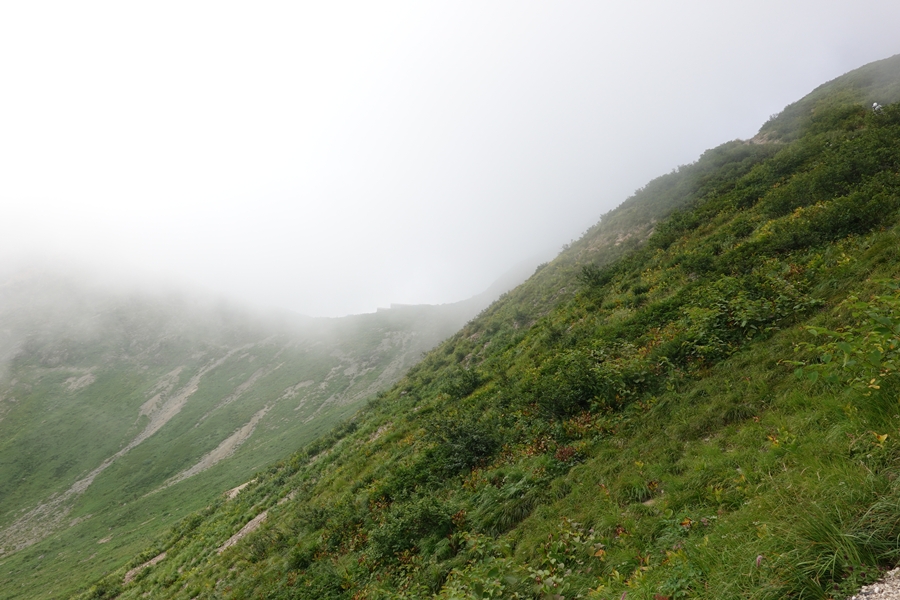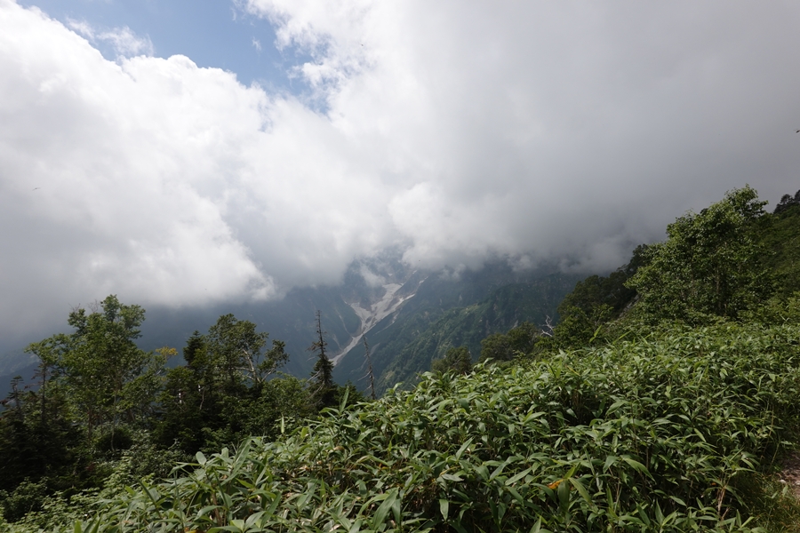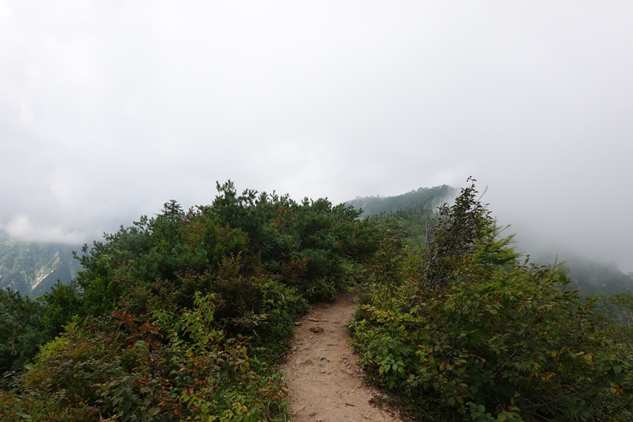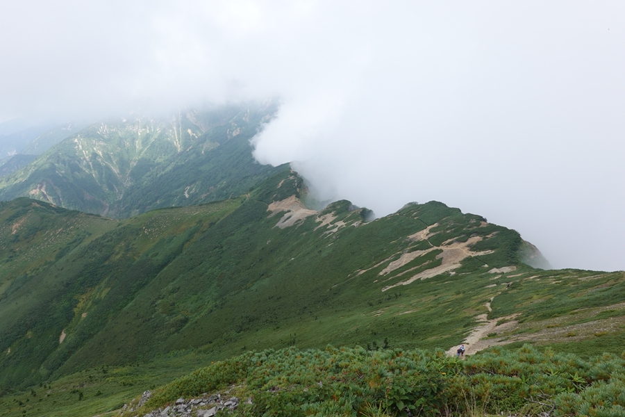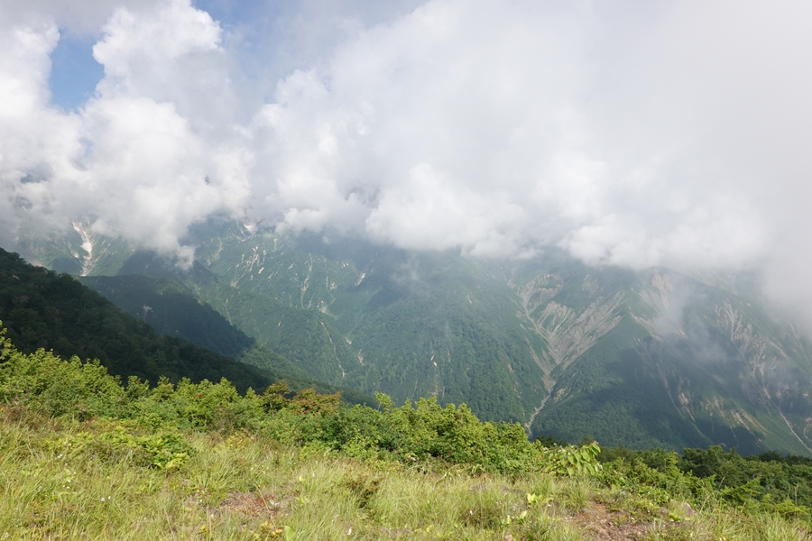 稜線沿いに出ると展望が開けました。 ガスは白馬村側で止まってる感。 |