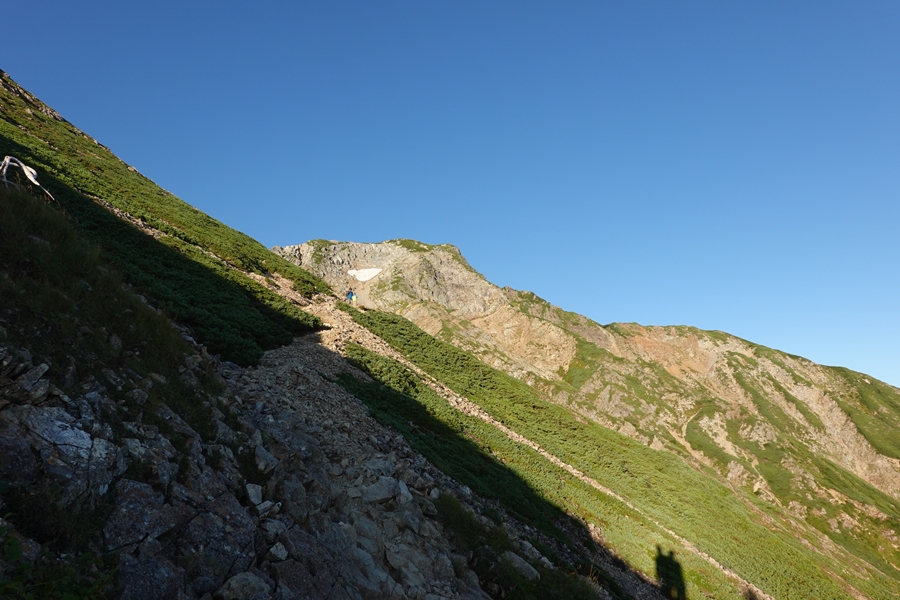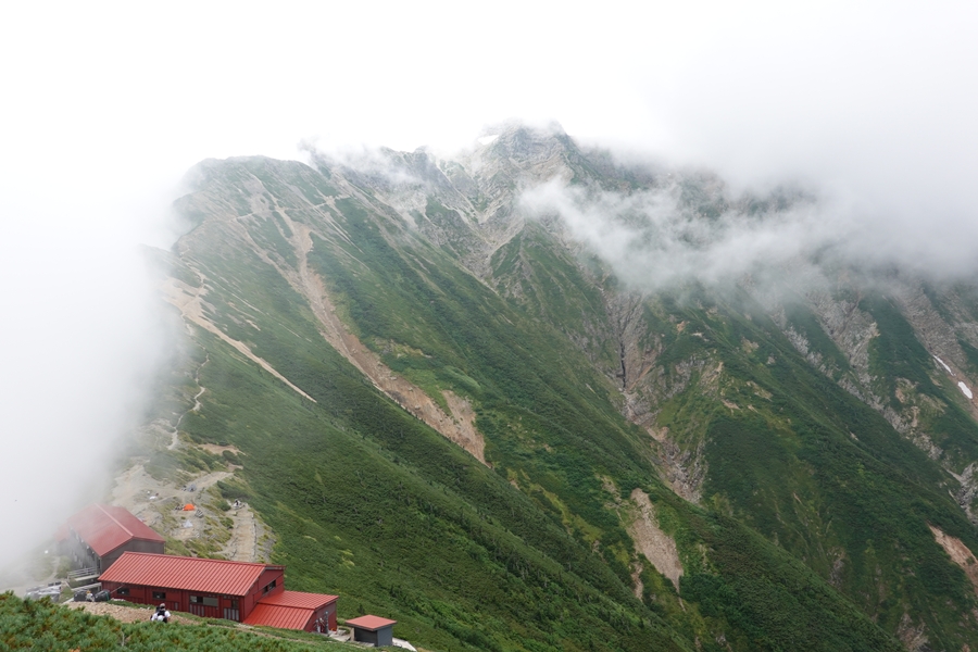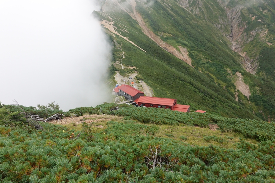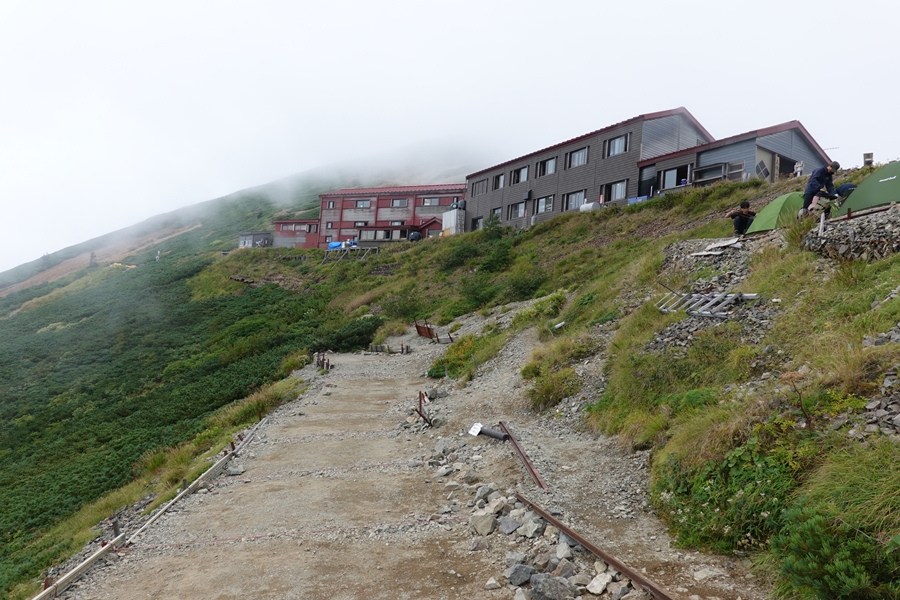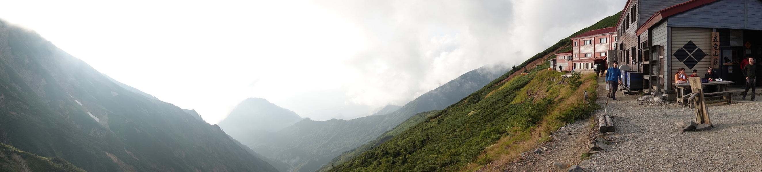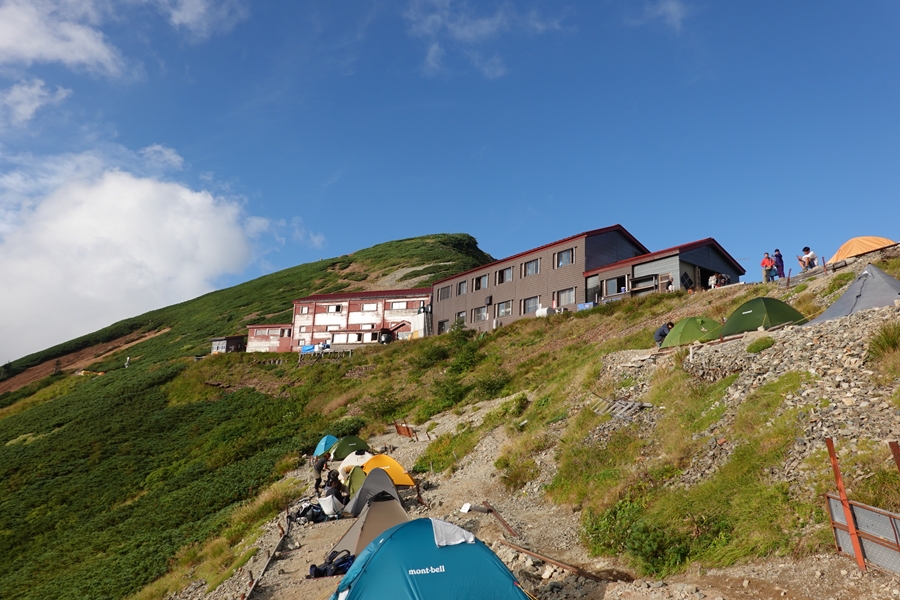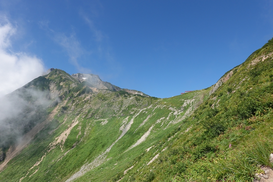 五竜山荘も目前〜。 久々のテント泊装備が重く疲れました。 |