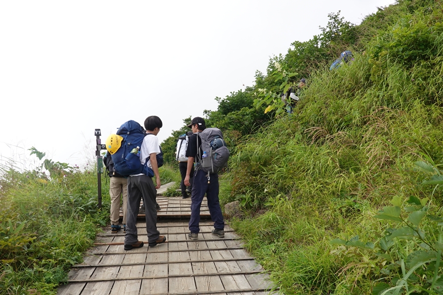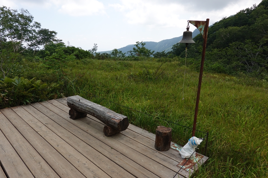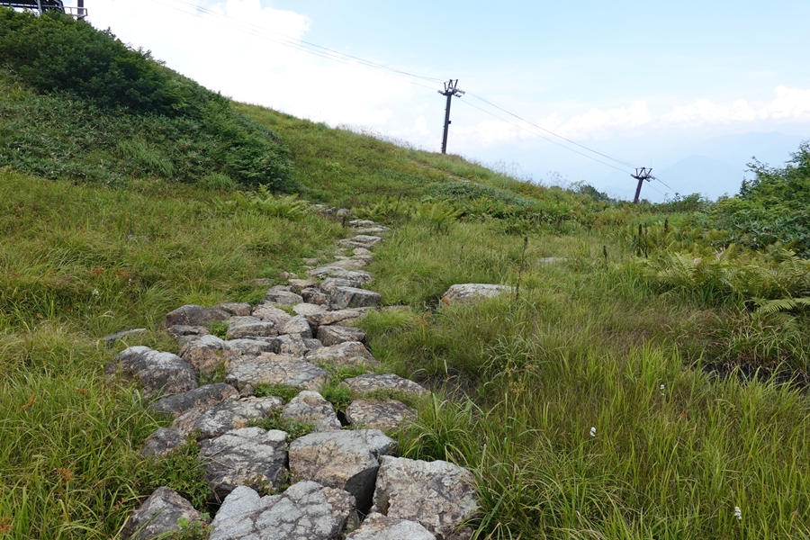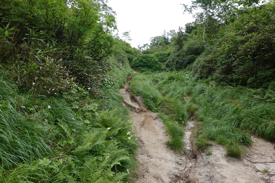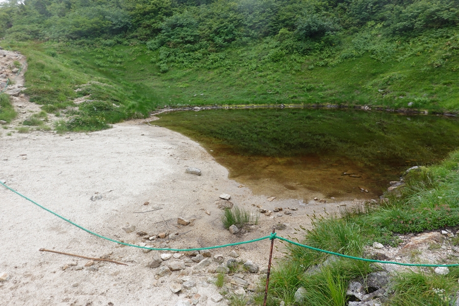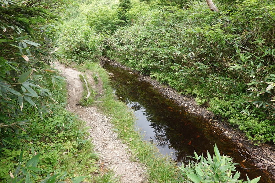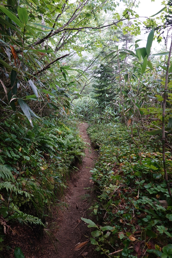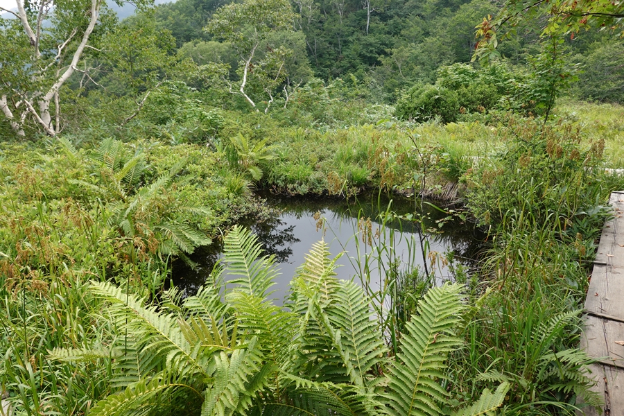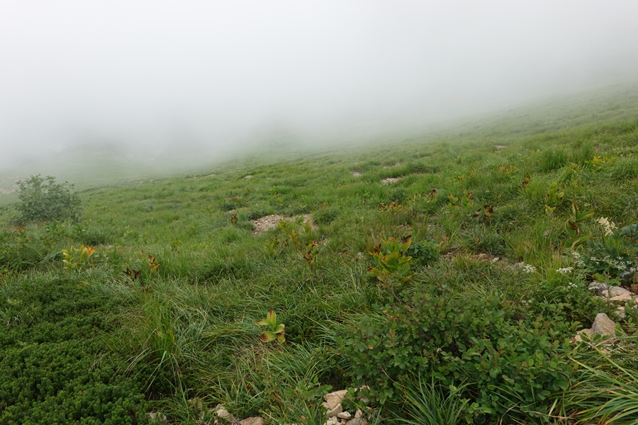 西遠見池までくると、後はなだらかな道を歩くだけ。 雲の中に入り、少し暑さがマシになりました。 |