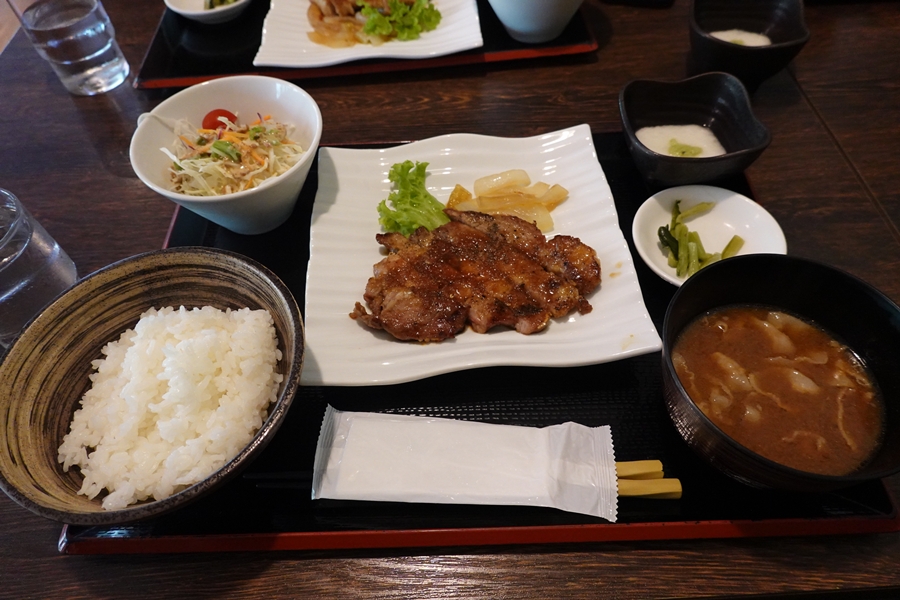 帰宅途中、道の駅おたりで昼食。生姜焼き定食セット、ご飯お替り自由・・3人ともお替り(笑)。 |