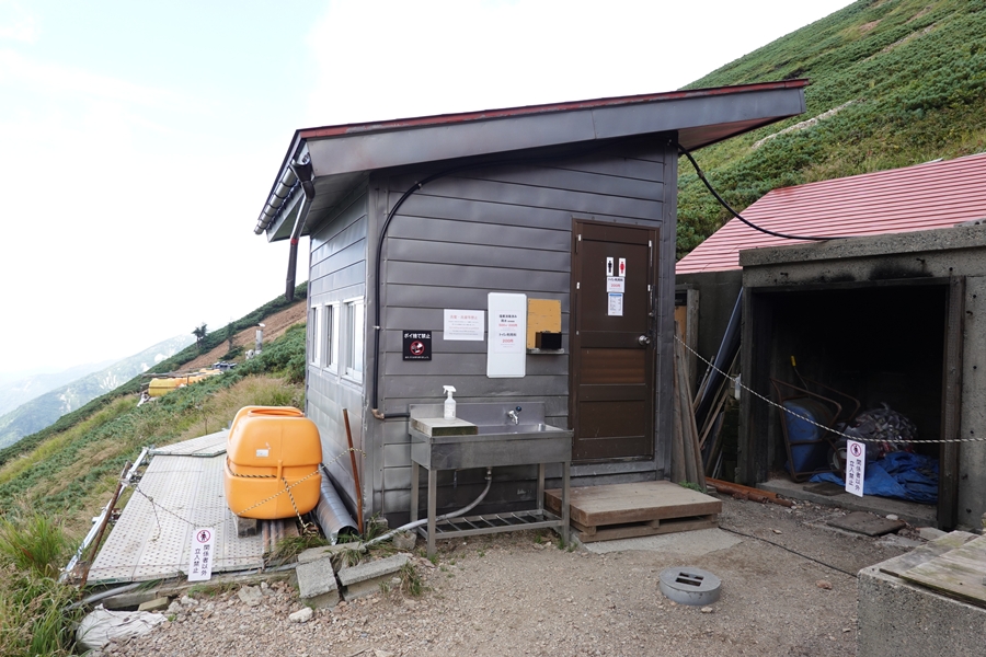 小屋奥にあるテント泊&外来者用のトイレ。 ここの水は雨水で500ml/200円でした。 小屋の売店のところは雨水を煮沸したのがあり、500ml/300円でした。 稜線上で水が確保できるのはありがたいです。 |