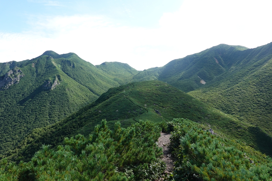 山行記へ 山の写真へ 山ある記Topへ ルート 第1日 清岳荘〜下二岐〜熊見峠〜上二俣〜馬の背〜斜里岳山頂〜馬の背〜上二俣〜熊見峠〜下二岐〜清岳荘 備考 累積標高差:約1100m コースタイム:第1日 7時間30分 第1日 学生の頃に羅臼岳を登って以来、実に28年振りの北海道の山歩きはお隣の斜里岳から。約30年の間にクマが増え、 どこを歩くにもクマが心配ですが、夏休みは人も多いから遭遇確率も低いかなと思ってました。そんなものでもないことを 翌日知るのですが。。前日の21時頃に清岳荘の駐車場に到着し車中泊。今回はキャンピングカーをレンタルしたので 寝心地良く、5時前に起床。青空が広がっていて、清岳荘のシーニックデッキという展望スペースからは雲海も見え、 気持ちのいい朝。前日受付時間の20時を過ぎていたので、受付で車中泊代の520円を支払い駐車場に戻ると、係?の方に 駐車スペース内にちゃんと止めるように注意を受ける。夜、真っ暗でキャンピングカーの駐車が怖く、2台分のスペースの 真ん中に真ん中に止めちゃってました。すみませんと言いつつ、何とか再駐車。前後左右ギリギリでしたね。。 朝食を食べて準備をするとあっという間に時間がたち、6時前に出発でした。ちなみに登山口には前日にも新道で ヒグマの足跡ありとの看板がありました。。 出だし、森の中を緩やかに下り5分ほどで林道に出ます。林道も少し下ってから緩やかな登りになり10分ほどすると 登山道になりました。なだらかな道を少し歩くと沢に出てここから渡渉の連続。渡渉は十数回、石の上を渡ったり、 浅瀬を歩いたりで超えていきますが、バランス崩すとドボンなところも・・ということで、妻は2度ほど水没し、 片方の靴が仲間でずぶ濡れになったよう。夏場で足が冷える感じはなかったようで、下山までには乾いてきたようですが、 スパッツぐらい持って行ってればよかったですね。そんなこんながありつつ、1時間ほどで下二岐に到着。下二岐からも 多くの方は旧道で沢沿いに登っていくようですが、沢に不慣れな我々は新道経由で登ることにして皆さんとは別ルートへ。 急登の道に変わりゆっくり登っていきます。登山道に気が張り出しているところもあり、頭をぶつけることも。 木々の間から斜里岳が見えるようになってきた後、尾根道に出ると傾斜が緩やかになり歩き易くなって熊見峠へ。 途中雲海が広がっていてきれいでした。雲の位置がだいぶ低いですね。 熊見峠は松の中で熊も景色も見れない感じでしたが、その少し先から見晴らしのより稜線歩きとなり、斜里岳から 南斜里岳の雄姿を見ながら歩けるいい道でした。既に下山されてくる方とすれ違いながらアップダウンを経て上二俣に 向かいます。途中から木の中に入ってしまうので一旦展望が無くなるのが残念ですが、ちらほら咲いている花を見ながら 歩いて9時頃に上二俣到着。ここから馬の背までは再び急登、日も当たって暑い道を登っていくとガスも上って来ていて 快晴だった山頂に雲がかかり始めてる。。馬の背からは再び見晴らしの良い稜線歩きで南斜里岳から熊見平方面の 景色を眺めながら歩けたのですが、着いた山頂は残念ながら雲が多くて四方のうち三方は雲で白くなってました。 1時間早く出発できる早起き力があれば・・我が家には厳しいですね(笑)。4時間かけて登った山頂で昼食を食べながら しばし休憩。知床半島は見えませんでしたが、1500m級ながら森林限界を超えていて、雄大な山並みや雲海が楽しめる 展望台です。30分ほど滞在し、記念撮影して下山開始。 下山は来た道を戻るので今度は多くの方と同じルート。旧道は下山で使うと危険なのでほとんどの方は新道で下山するよう。 全体的に登りと同じくらい時間が掛かり、特に熊見峠から下二岐の間で多くの方に追い抜かれながら歩く。懸念の渡渉は 無事通過して水没せずにすみました。ストックがあるとバランス取れて歩き易かったと妻・・登りの時にも使う?って 聞いたんだけどな。。そんなこんなでスタートから8時間以上かけて登山口に無事に戻りました。熊にも会わずに良かった なと。清岳荘で山バッチを買い、自動販売機で冷たい飲み物買って阿寒岳の登山口、オンネトーへ向かったのでありました。 清岳荘に行くためにはダートの道をしばらく走らないとならないのですが、キャンピングカーの運転初日に夜凸凹の坂道を 走るのが一番大変だったかも。520円でトイレの使用料も含まれていて、飲めないけれど水場もあるので車中泊するには いいとこでした。阿寒に向かう途中で見えた斜里岳の姿もご立派でしたね。 2025.8.24記 |